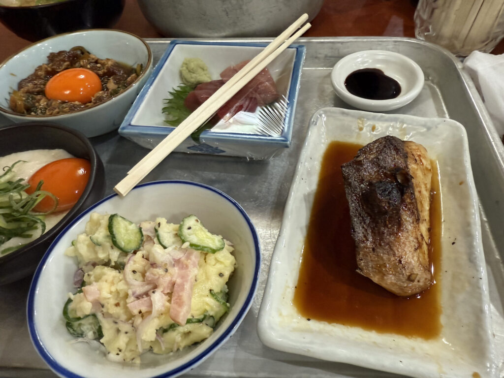 刺身、揚げ物、煮物、サラダ、汁物、色々あった。そんな種類は多くないけど、必要十分って感じだな。